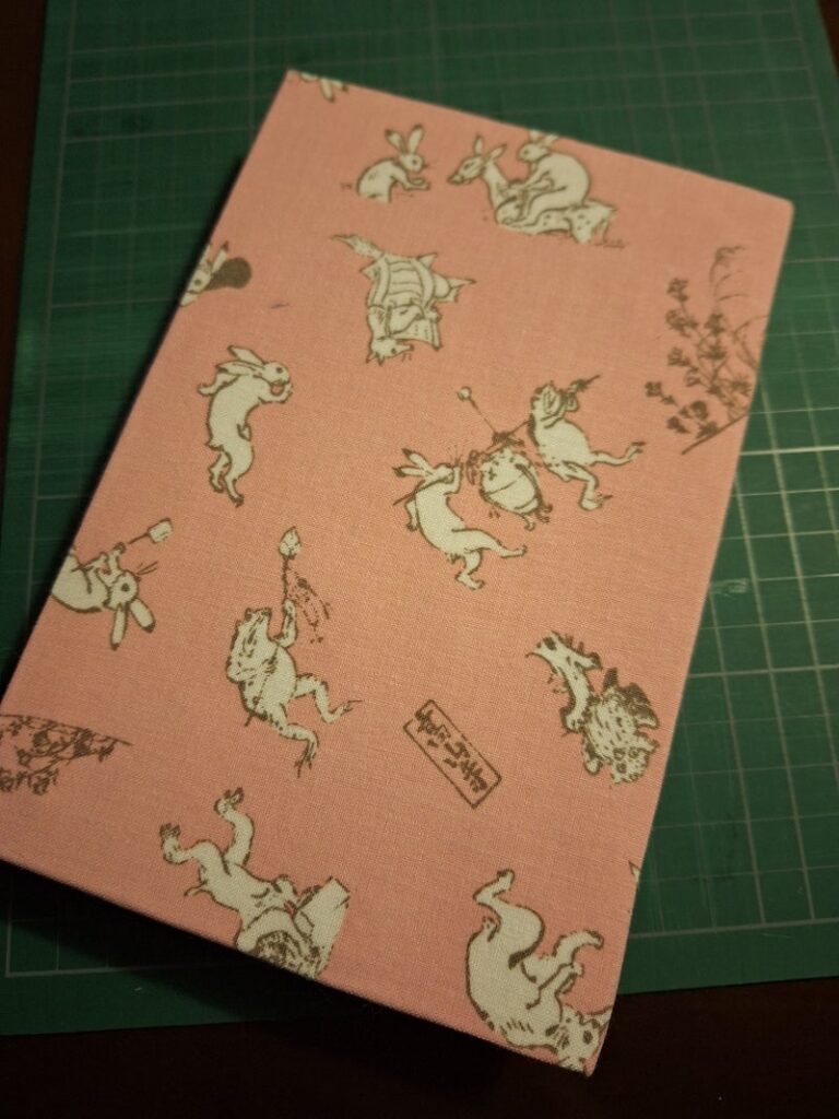 鳥獣戯画の手ぬぐいを使ったのですが、いろいろな柄が散らばっているデザインなので