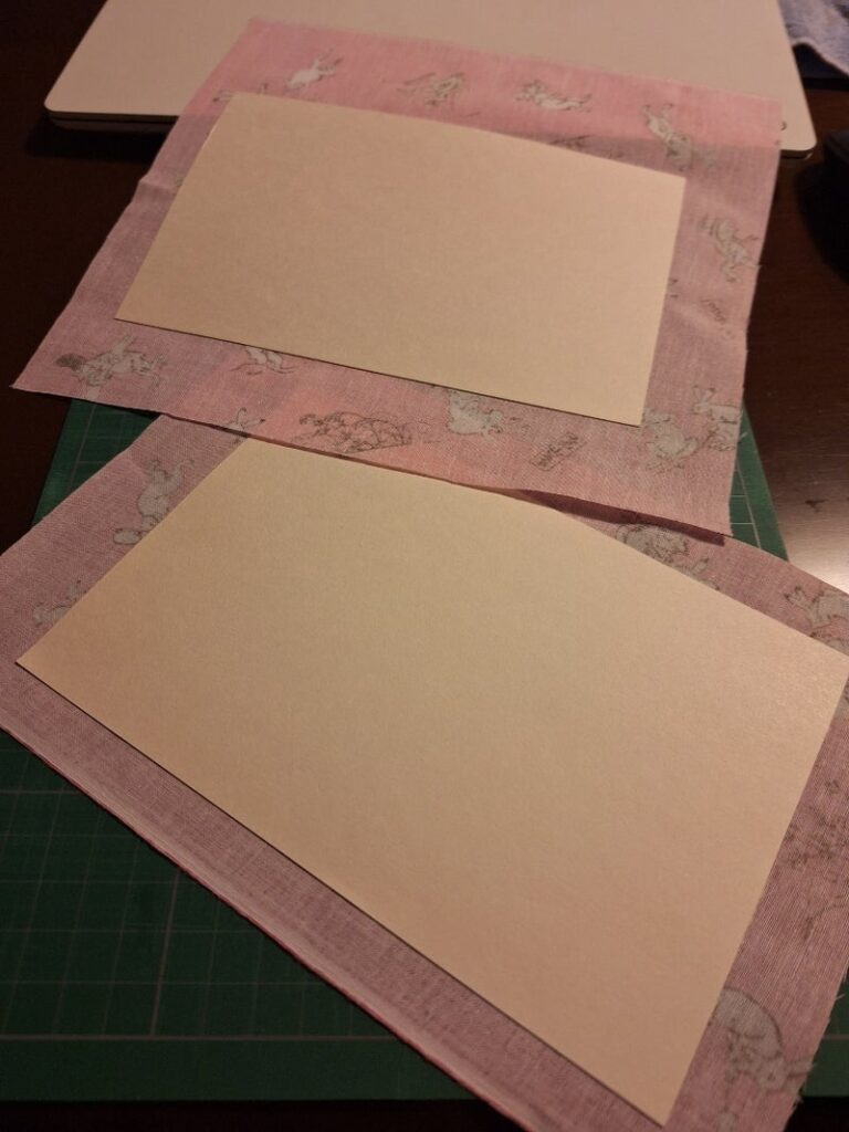 キットに入っている表紙用の厚紙に裏打ちシートを貼った布や紙を張り付けていきます。